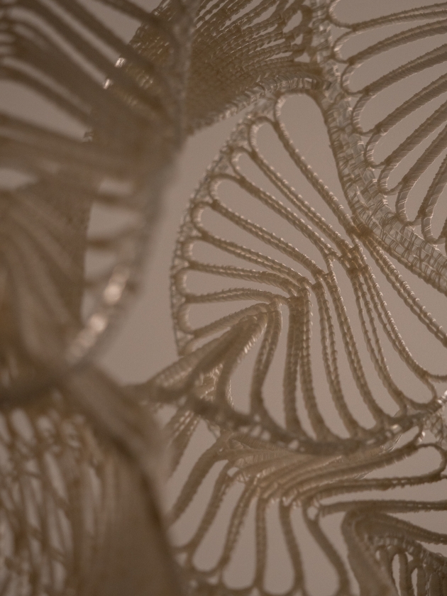 I use weaving techniques to create sculptural forms. By combining soft and firm materials and constructing basket-like structures, I aim for the formation of organic shapes.