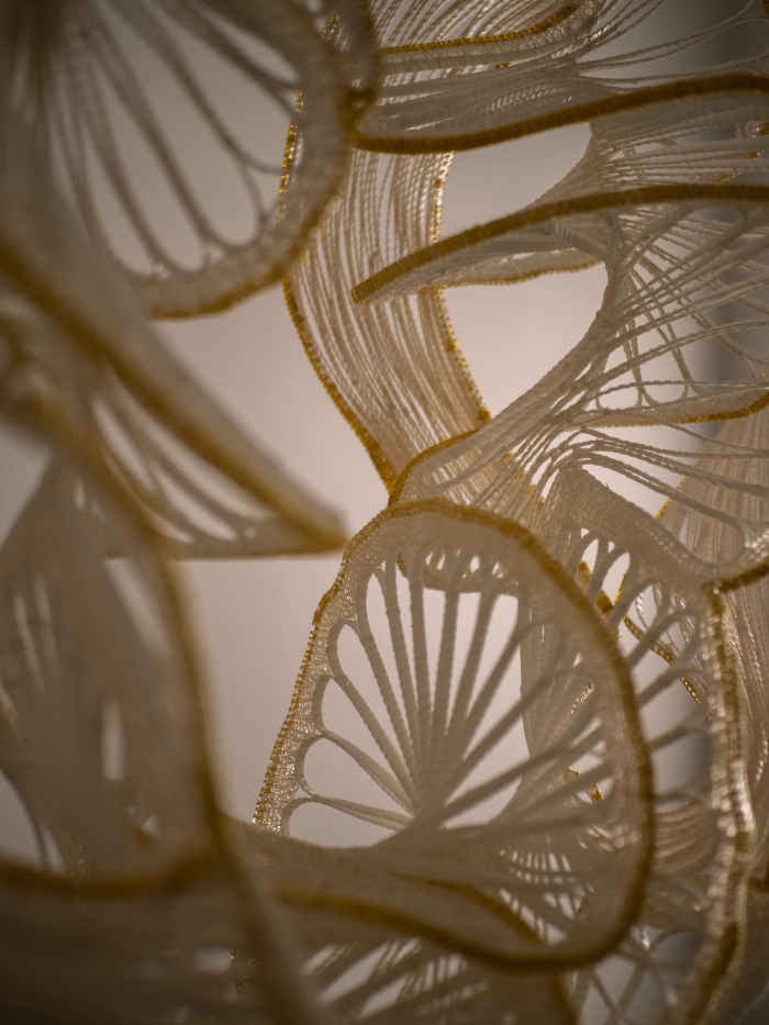 編みの技法を用いて彫刻的な形態を創造しています。かごの構造に着想を得て、張りのある素材に糸を巻き重ねながら立体を組み上げ、有機的な形が生まれる可能性を探っています。
